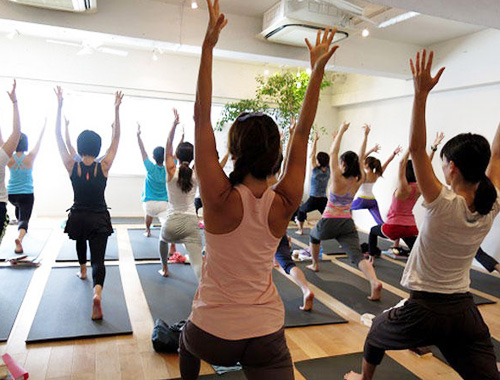 レッスンはじめに行われる参加者全員の簡単な自己紹介や、レッスン中のペアワークを通じて、生徒さん同士が仲良くなるスタジオ。「ヨーガを実践する人たちが環境保護に力を入れ、環境保護に関心のある人たちがヨーガや瞑想をするといった循環を作りたい」と乳井先生。困っているひとを助けるのもヨーガの叡智。これまでに寄付した義捐金は100万円近く。ヨガマットはカーボンオフセットしたトゥリーバーク(2011年春終売)を採用。