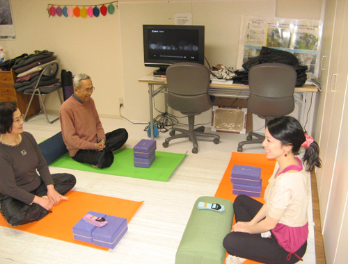 レッスンの場所を自由に設定できるのは、個人で活動するインストラクターにとって大きな利点。ただその反面で、プロップスの保管場所や移動手段に困ることも。「そんな時に、レンタルサービスを利用させてもらうようになって、プロップスを使うことで高齢者の方たちも、安心してヨーガに参加してもらえるようになりました。」と呂美先生。