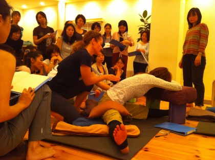 さて、ワークショップは、ウオームアップ(Bharadvajasana→Upavista Konasana)でスタート。