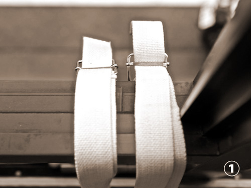 3.ベルトを交差させ右側のベルトに左脚を、左側のベルトに右脚を入れます。