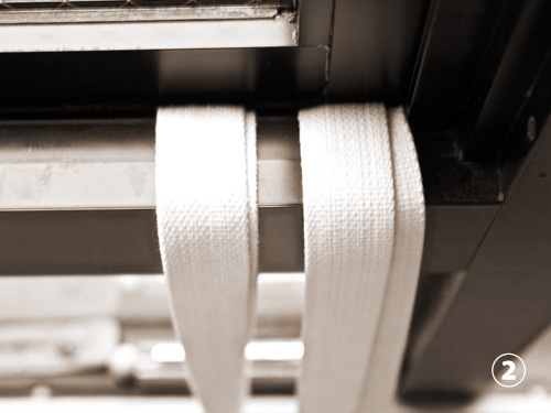 1.ヨガベルトを2本使います。ヨガベルトで輪っかをつくったらバックルの方を窓枠の外に垂らします。